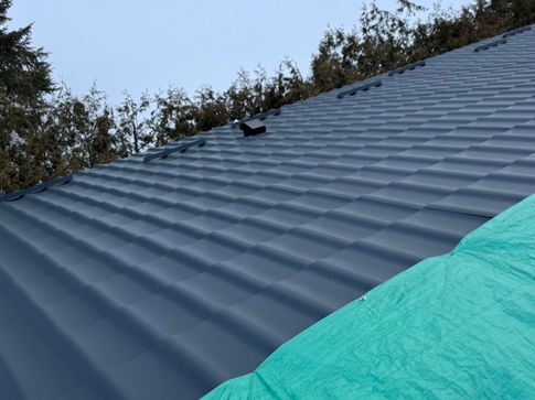 The new addition is now fully protected from snow and rain. The metal roof covers the structure and keeps the wood dry. We secured all the sewage pipes. We installed a roof boot for the washroom vent. We covered the ridge vent with a breathable membrane. It protects it from insects, dust, and snow. Gables were installed where needed. The house is now ready for the next stages of construction.