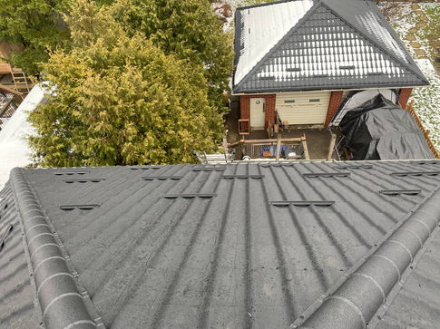 The homeowner’s driveway is directly below the roof slope where the car is parked, so we suggested adding extra snow stops to prevent heavy snow from falling off the roof during the winter. This will help protect the vehicle and improve overall safety. Along with the main roof, we completed the garage roof using the same technique.
