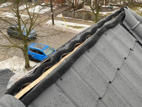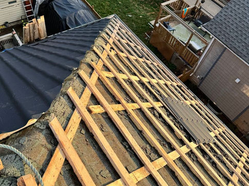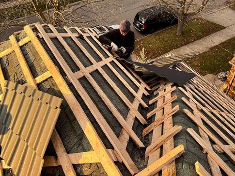We started by adding double wood strapping on top of the existing roof. Since the old roof had begun to curl, it was necessary to provide a straight and solid foundation before proceeding. This step also enhances ventilation and ensures the entire metal roofing system functions properly.